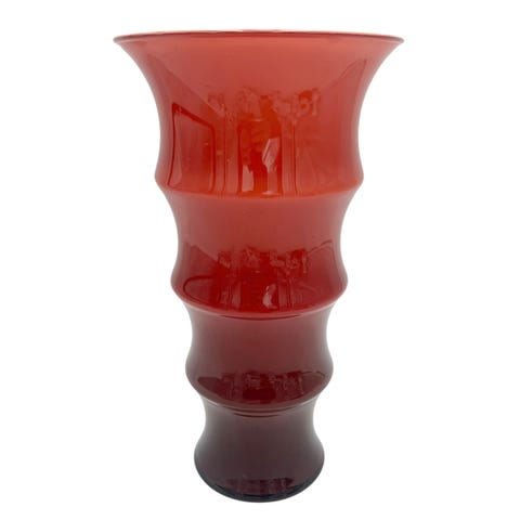 Formen er inspireret af afrikanske kvinders hals- og armringe og er kendetegnende for Karen Blixen-serien. Vasen står elegant både alene og med blomster og fungerer som et markant designobjekt i hjemmet. Original Holmegaard-mærkning ses i glasset.