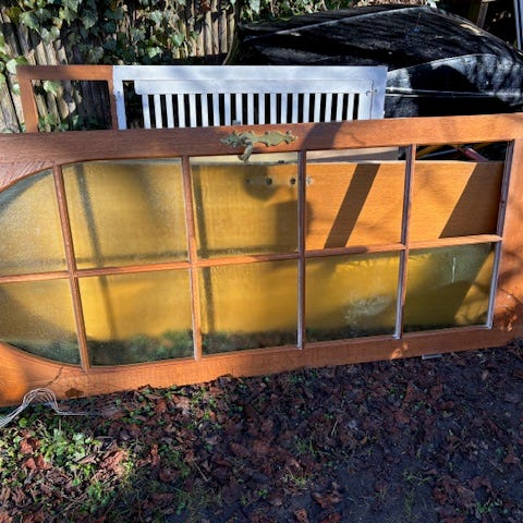 Måler 74 x 195. Glasfelterne måler 55 x 107 og 55 x 51. Der er savet et lille hjørne af for oven, som ses på billede. Sort bakelit håndtag. Uden karm.