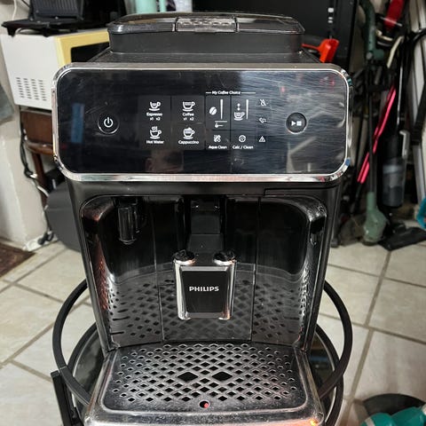 Philips fuldautomatisk espressomaskine i sort farve. Maskinen har et brugervenligt kontrolpanel med touchknapper og en integreret mælkeskummer. Designet til at brygge espresso og andre kaffedrikke med frisk mælk. Passer til hjemmebrug.