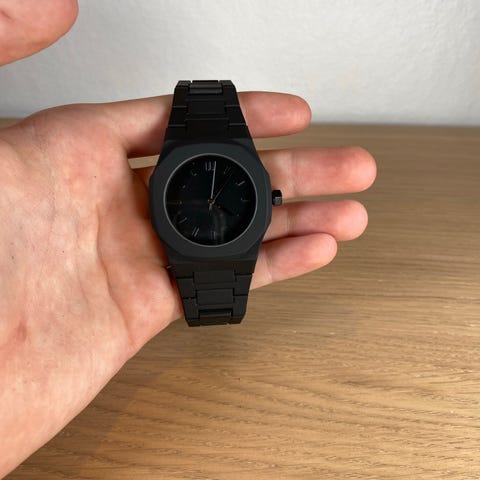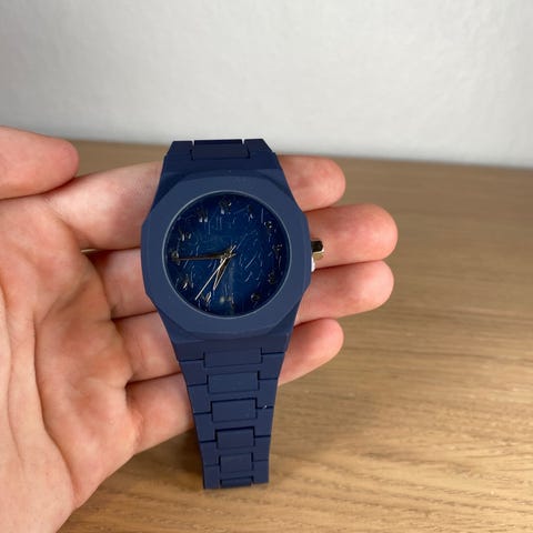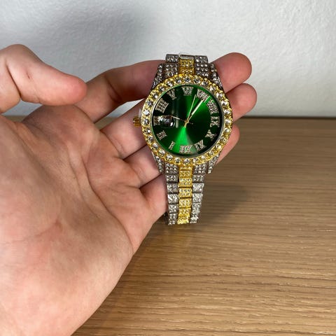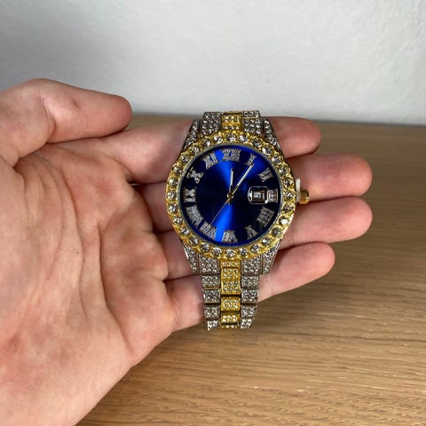 Poedagar unisex ur med blå urskive. Uret har en tofarvet metalrem med krystaller på både urkassen og remmen. Uret viser dato og har romertal på urskiven.