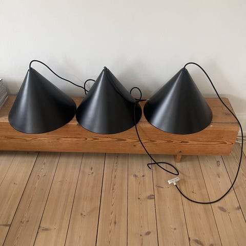 Skærmenes diameter er 37 cm, hvilket sikrer et utroligt flot lys. Lampen leveres med fatning og kædeophæng, som kan justeres i længde.
