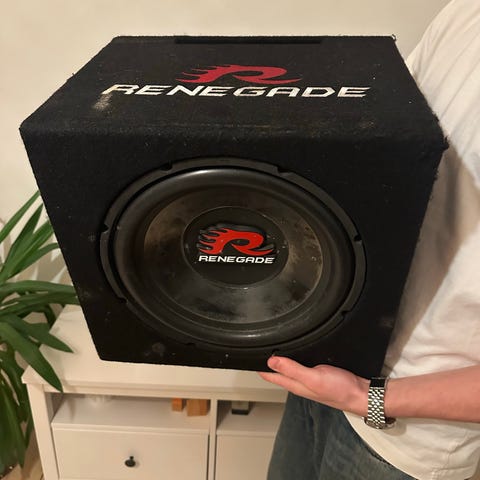 Renegade subwoofer i kasse samt Renegade 2-kanals forstærker sælges samlet.
