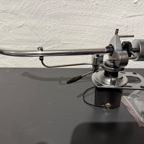 Silver Note 512R fin tonearm i Rustfristål med DIN stik tilslutning, den er Ø 22,7mm til montage så den må passe til Rega, der medfølger en SME adapter som også kan ses på billederne