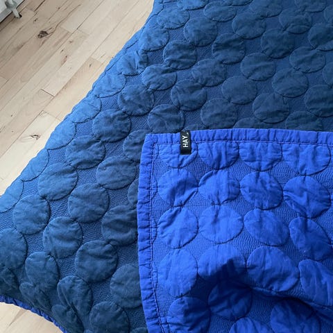 Hay Mega Dot tæppe med målene 235x245 cm i gul farve. Tæppet er fremstillet af 100% bomuld og har et quiltet mønster med cirkler. Det er velegnet til brug som sengetæppe eller dekorativt tæppe i hjemmet.