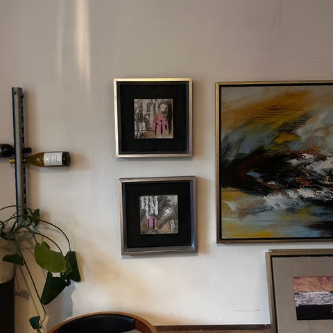 Mål: 35 × 35 cm. Mixed media på lærred. Indrammet i markant sølvramme med sort passepartout.
