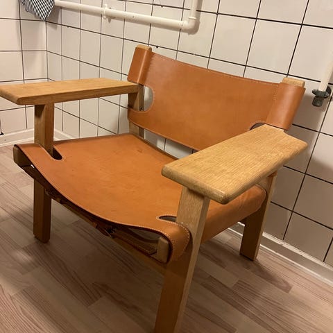 Den Spanske Stol af Børge Mogensen. I god stand, men med smuk patina som vist på billedet. Kom evt. med et bud. Kan hentes på Østerbro eller i Ordrup.