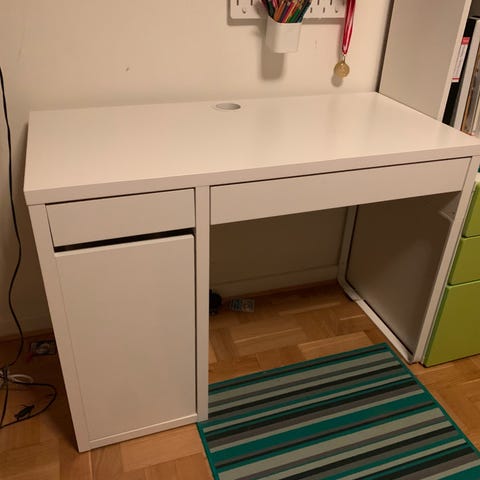 Bordet har en skuffe og et hul til ledninger eller kop. Passer til børneværelser og mindre arbejdsområder.