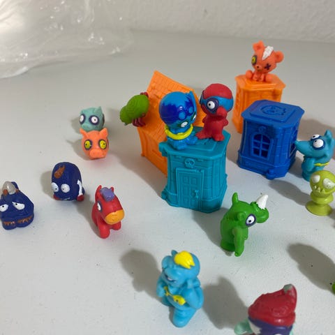 Bakugan legetøjssæt med forskellige figurer og en blå opbevaringskasse. Sættet indeholder flere små figurer i forskellige farver og former, samt tilbehør til leg. Egnet til børn til leg og samling.