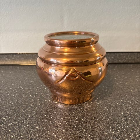 Kobberkrukken har en rund, hamret bund med mørk patina og en glattere overdel med bred, let bølget åbning.