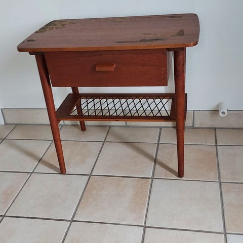 Bordet har synlige kradsemærker fra da det blev samlet og synlige produktionsfejl i bordpladen.