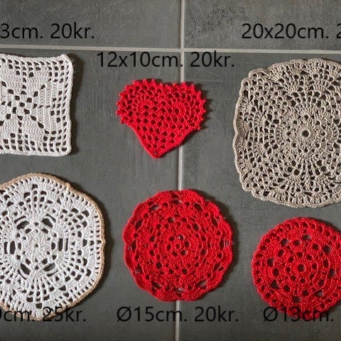 10 hæklede duge flaconer i ferseknfarvet og grøn, hjemmehæklet retro fra 70erne, 10 forskellige duge og flaconer hjemmehæklede i 70erne alle i fin stand . de største over 35 cm i diameter og alle hæklet af min gamle mor i 70erne i merciceret bomuld og bomuld på tynde hæklenåle. sendes for købers regning eller hentes her