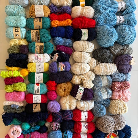 Hvert garnnøgle vejer ml. 43 og 56 gram, 13 nøglers samlet vægt er 602 g. Dertil rester ca. 50 g.