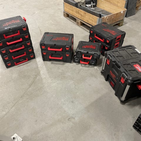 Milwaukee værktøjskasse i sort plast med rød lås og håndtag. Indeholder flere rum og opbevaringsplads til værktøj og tilbehør. Velegnet til opbevaring og transport af forskellige typer værktøj.