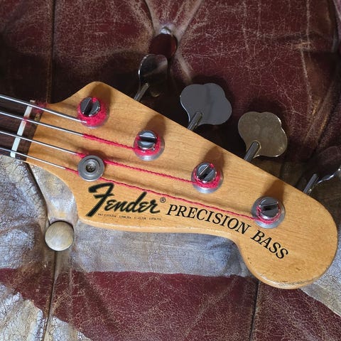 1973 Fender Precision Bass Sunburst with good original finish and original 73 pots. Neck is a very cool custom swapped Jazz Bass maple fretboard block inlay that has been stained, so you get the best of both worlds from the P-bass and the iconic 70s block inlay Jazz neck. Comes from a pro UK artist and subsequently a major London recording studio. A killer vintage bass with a one-off look that will make any player stand out on stage! People pay thousands for brand new reissues from this era and even more for fake "ageing" and the relic look. Why not get an actual vintage Fender that's over half a century old?