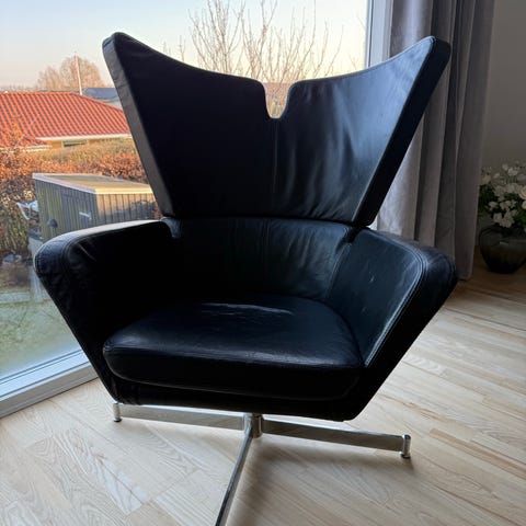 Ilva lænestol i sort læder med drejefod. Lænestolen har et minimalistisk og moderne design med polstret sæde og rygstøtte i sort finer. Der er god konfort, og stolen fylder ikke så meget i rummet, da den ikke har armlæn.