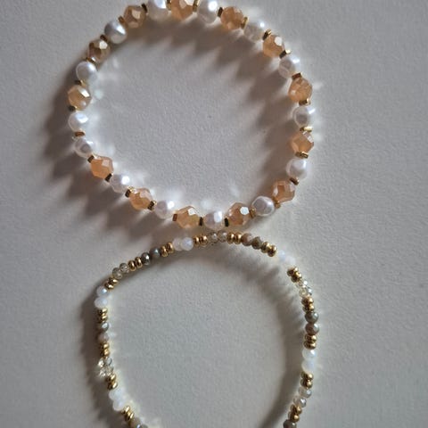 Mange forskellige perlearmbånd sat på elastik, omkreds ca 17-19 cm.