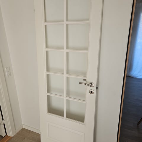 Swedoor Hvid glasdør med mål på 200 cm i højden og 72cm i bredden. Døren har en ramme i hvidt materiale og er egnet til indvendig brug.