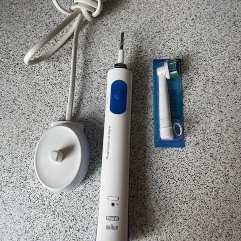 Braun Oral-B Genius 8000-9000 med oplader, etui (fungerer som oplader), 6 nye Precision Pro børstehoveder og manual. Jeg tror, det er en D701 Black 6mode Type 3765. Kører godt men batteriet holder kun et par dage eller tre ad gangen.