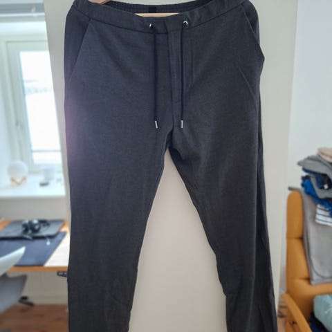 De er desværre blevet for lille (Jeg er ca. 194 cm høj). Den er i størrelse 48 og lavet af 97% bomuld, 3% Elasthan. Jeg kunne umiddelbart ikke se, at der var noget galt med dem, men de er selvfølgeligt blevet båret og vasket nogle gange. De kan godt sendes, men så kan de selvfølgelig ikke prøves på. Ved spørgsmål må du gerne kontakte mig.