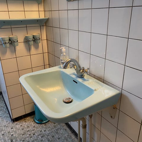 Vintage, design, kvalitet, badeværelse, wc, toilet, muslingelampe, væglampe, vask, håndvask, knage