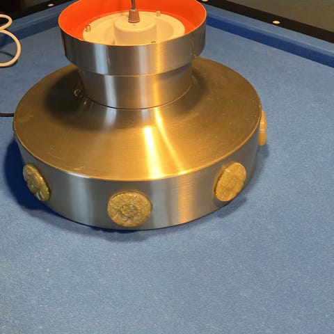 Original svensk designklassiker produceret af Granhaga Metallindustri. Denne Trava er den sjældnere udgave med svungne, lagdelte skærme i messingfarvet metal og rødlakeret inderskærm, som giver et varmt, blændfrit lys og et skulpturelt udtryk. Et ikonisk 70’er-design, der fungerer smukt i moderne hjem.