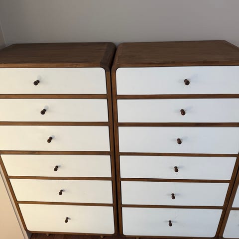 Custom made kommode i olieret eg med hvidlakerede skuffer, lavet af letvægts genbrugstræ i Nova Møblers eget værksted i Vietnam. 4 år gammel, nypris var ca.6.000kr