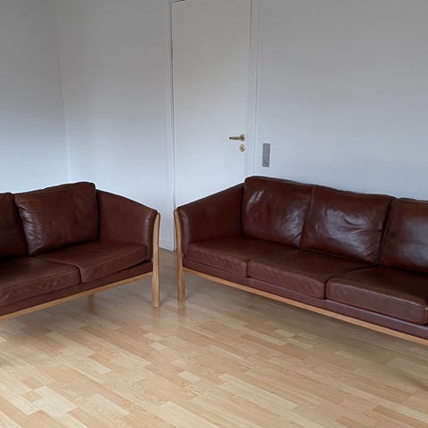 Sofagruppe og sofabordet sælges samlet. 2 Pers sofa 190 cm og 3 Pers sofa 220 cm i ægte sort læder. Sofabordet er et egetræsbord.