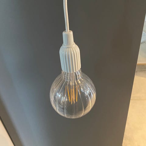 2x Loftlampe med hvid porcelæns fatning og rund glødepære. Lampen har et enkelt design med en synlig glødepære, der giver et varmt lys. Passer til ophæng i loft og kan anvendes i forskellige rum som køkken, stue eller entré.