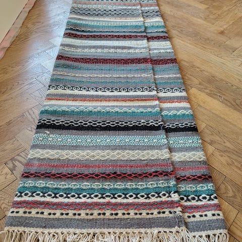 Vævet gulvtæppe i bomuld med målene 70x160 cm. Tæppet har et mønster i sort og hvid med striber og frynser i enderne