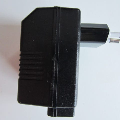 Den har et rundt stik med en diameter på 5,5mm og en pin på 2,1mm i midten.