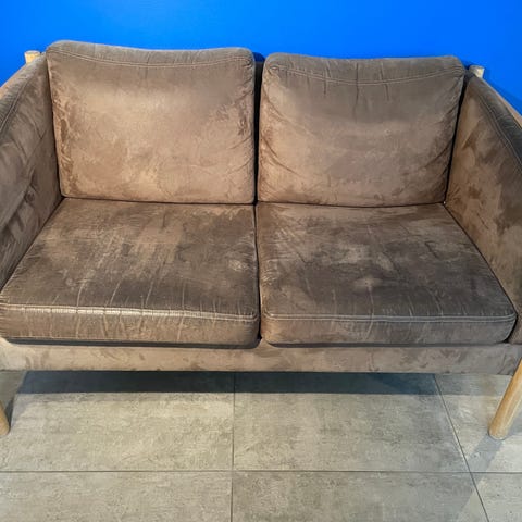 2-personers grå sofa med et slidt armlæn og en synlig plet i stoffet. Ellers i god stand og en fin sofa.