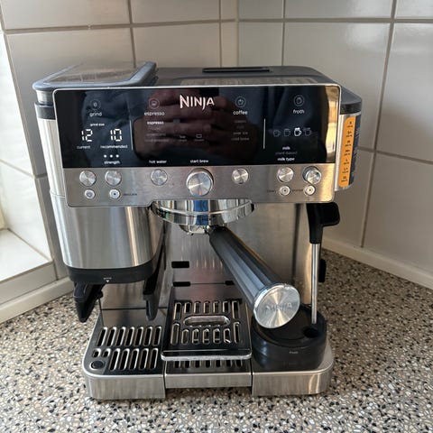 Ninja espressomaskine til brygning af espresso og kaffedrikke. Maskinen har en integreret mælkeskummer og et brugervenligt kontrolpanel med knapper og drejeknap. Velegnet til hjemmebrug til tilberedning af forskellige kaffespecialiteter.