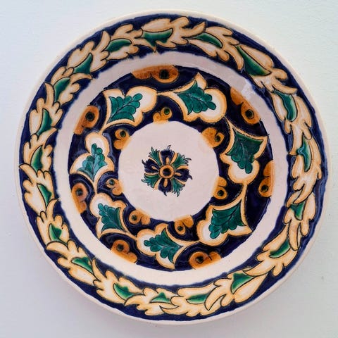 Smukt sæt med 4 ældre spanske håndmalede keramikplatter, alle signeret “Gonfer” på bagsiden. Platterne har en flot dekorativ bølget kant og egner sig perfekt som vægdekoration Alle fremstår i pæn stand uden skår eller revner (se billeder).