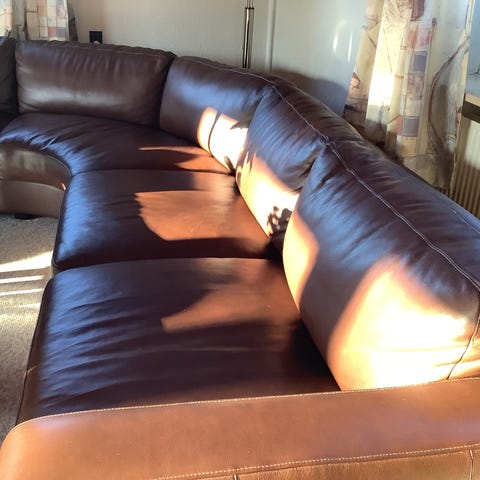 Stor lædersofa hvor der er plads til familien , 7 personer minimum ,farve sort ,sidde højde er 40cm ,længde 350cm ,bredde 210cm