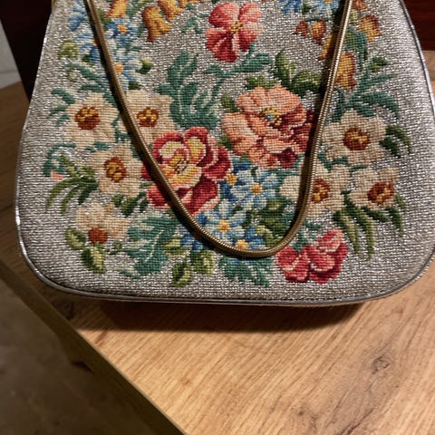 Dette er en lille taske dekoreret med mikro-korsstingsbroderi i mandala-stil i nuancer af blå, lilla og lyserød. Kædehåndtaget og låsen er metallisk, let falmet maling guldfarvede.