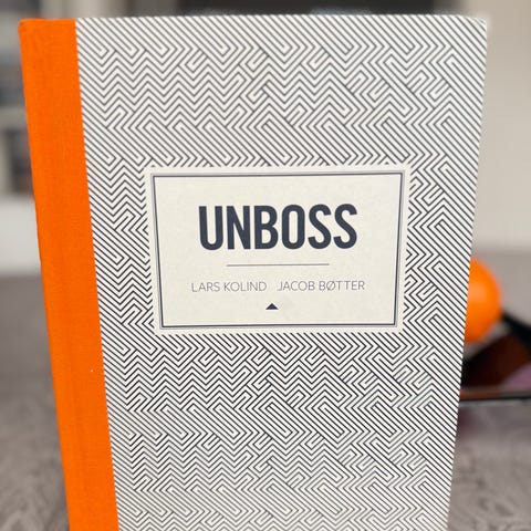 Unboss bog med orange ryg og mønstret omslag. Bogen har et tekstomslag med information på bagsiden.