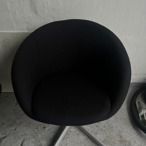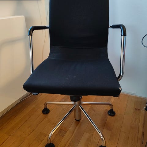IKEA Aage Petersen dreje-stol med sort sæde i læder og krom stel. Stolen har et enkelt og funktionelt design, velegnet til forskellige indendørs miljøer.