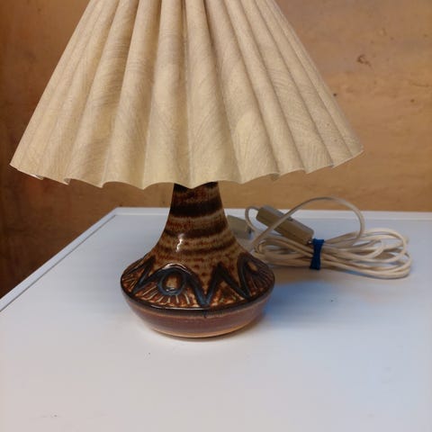 Lampen er velholdt 40cm med skærm og 20 cm uden, 13cm i diameter. Den er grå.
