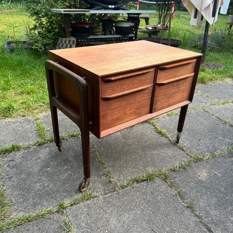 Fin teak træ kommode med hjul under, så kan nemt rykkes rundt. Har mistet listen på den venstre side i bunden, se billede.