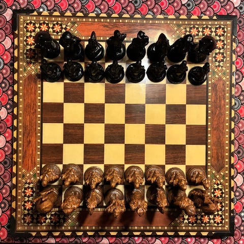 Stor plade i krydsfiner. Måler 47 x46,6 cm. Nogle brugsspor. Et sæt skakbrikker i marmoreret plastik. Kongen er 9 cm, bonden 4,5 cm.