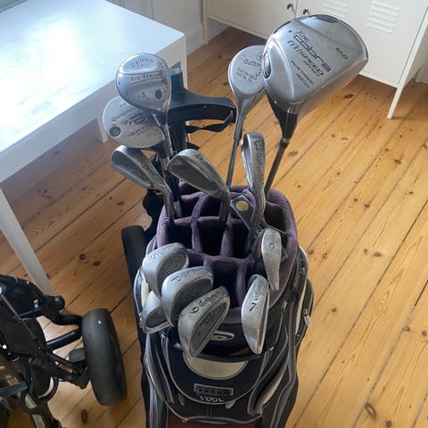 golfudstyr sæt med blandet køller og trolley i farverne rød, blå og hvid. Sættet inkluderer golfkøller og en trolley med to hjul. Sættet er af ældre dato