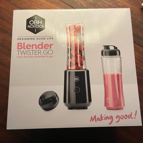 OBH Nordica Twister Go blender med to-go kopper. Blenderen er designet til nem tilberedning af smoothies og shakes direkte i koppen, der kan tages med på farten. Produktet inkluderer en blenderbase, to kopper med låg og de nødvendige dele til montering.