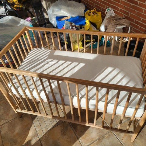 IKEA tremmeseng til børn med tremmer i naturligt træ. Sengen er designet til at give sikkerhed og komfort til små børn under søvn og hvile.