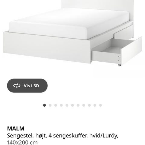 IKEA Malm sengestel i hvid farve med mål 140x200 cm. Sengestellet har en enkel og funktionel design med opbevaringsmulighed under sengen (2x sengeskuffe). Materialet er robust og egnet til daglig brug.