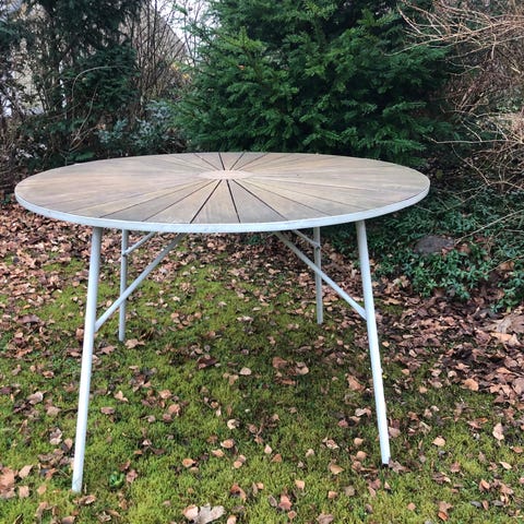 Udendørs havebord med bordplade i træ. Bordet er købt sidste sommer men er for stor til min altan. Trænger til lidt kærlighed i form af sæbe og olie.