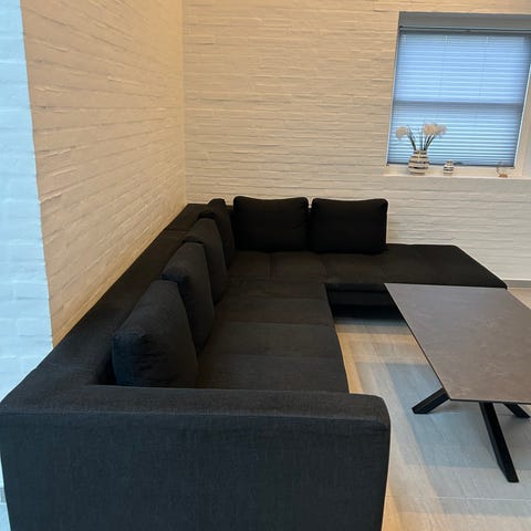 Grå hjørnesofa med chaiselong i stof. Sofaen har et moderne design og passer til stuer med behov for hjørneplads og ekstra siddepladser.