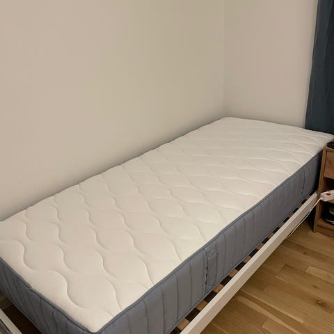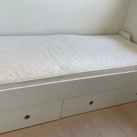 IKEA seng med madras i hvid. Sengen har indbygget opbevaringsskuffe under sengen og et hvidt sengegavl. Madras med quiltet betræk. Sengen er velegnet til enkeltpersoner og kan bruges i soveværelse eller gæsteværelse.