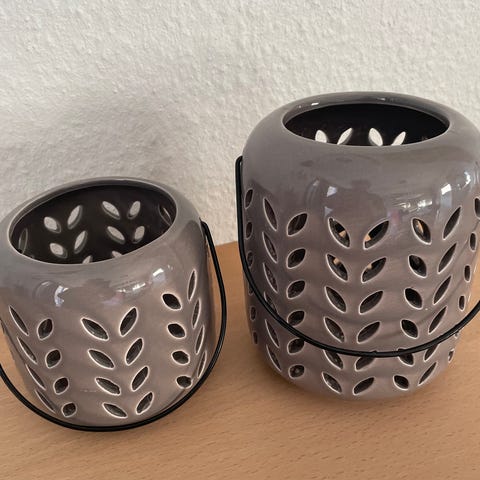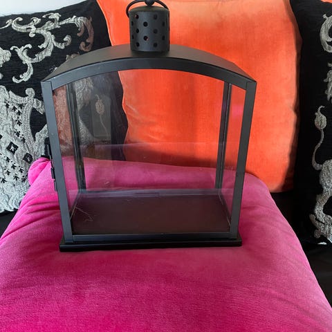 Sort metal lanterne med dekorative udskæringer, velegnet til indendørs eller udendørs brug som dekorativ belysning. H: 18 - B: 12,5 - Ø 9 cm. Fra røg og dyrefrit hjem.