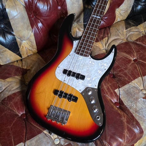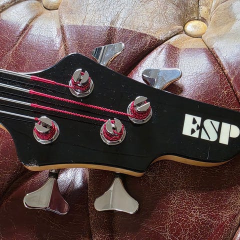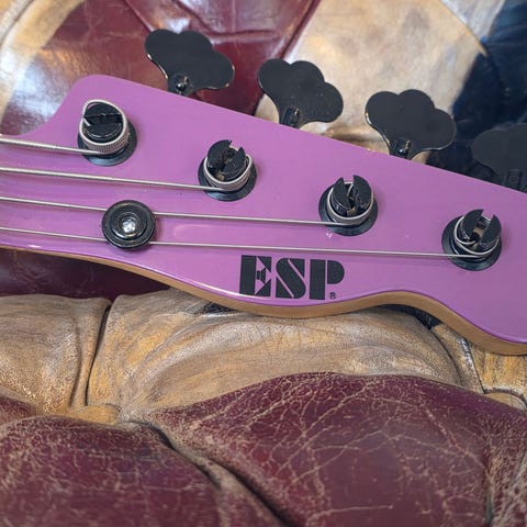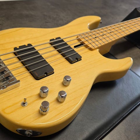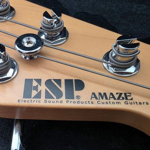 ESP SURVEYOR II 5 String Bass 2006 in black on ash body. This is the ultimate Swiss army knife of bass guitars. You get a Fender Precision Bass, a Fender Jazz Bass, a Music Man Stingray Bass and an ESP standard metal bass all rolled into one thanks to its special EMG pickups and active electronics. The body is clearly styled after a Fender Precision bass, which should have most pro players immediately comfortable playing this. You get an active EMG B30 REV-S 3 Band EQ for dialing in Precision tone. You get the monster EMG MMTW bridge pickup with coil tap to switch it from being a Music Man Stingray pickup to being a Jazz Bass pickup. You then get the EMG 35P4 Precision Bass pickup with extended range in the neck position. You will throw away your other basses after you get this. I am selling off my entire bass and guitar collection now, otherwise it would stay. Excellent condition with only minor marks. Comes with original hard case, which has a broken centre latch and back hinge, but will absolutely keep the bass perfectly protected in shipping.