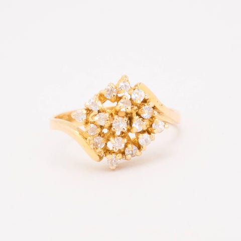 Clusterring i 14K guld med flere hvide og røde sten, Str.